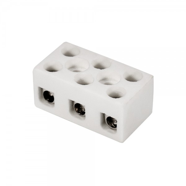 Керамічна клема з 3 полюсами. Переріз дротів 4 мм². Номінальна напруга 250 В, струм 15 А. Розміри 35 / 19 / 16.5 мм, вага 25 г