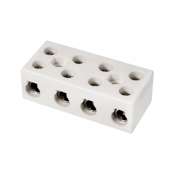 Керамічна клема з 4 полюсами. Переріз дротів 6 мм². Номінальна напруга 500 В, струм 30 А. Розміри 58.5 / 26 / 19 мм, вага 73 г