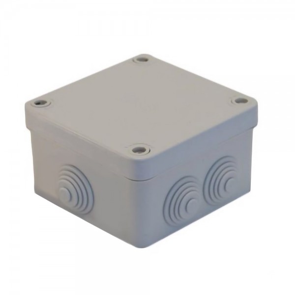 Коробка розподільна з кабельними вводами, з розмірами 110 / 110 / 65 мм, сіра. В комплект входять нові самозажімні пластикові болти, наскрізні отвори в корпусі коробки для кріплення до стіни, що не порушують герметичність коробки. Не піддається корозії, ударостійка і стійка до тиску. Виготовлена зі стійкого полімерного матеріалу. Властивості самозагасання. Не розповсюджує горіння
