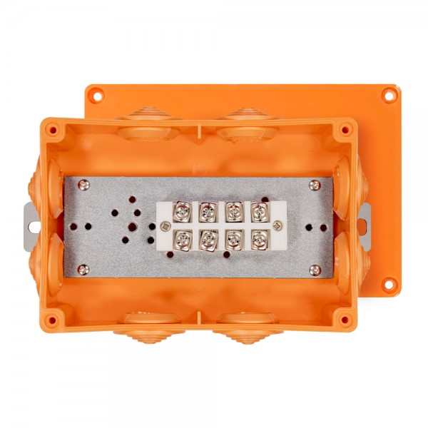 Вогнестійка розподільна коробка з класом вогнестійкості Е90; 4 керамічні клеми діаметром 10 мм; напруга комутації 500 В, максимальний струм у лінії 20 А; 8 кабельних вводів; розміри 155 / 105 / 48 мм