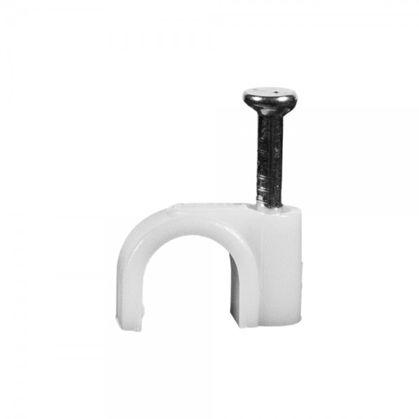Скоба з цвяхом для кріплення кабелю діаметром до 6 мм; матеріал корпусу пластик, цвях зі сталі; монтаж без свердління – встановлення за допомгою забивання цвяха молотком; постачається комплектом 100 штук
