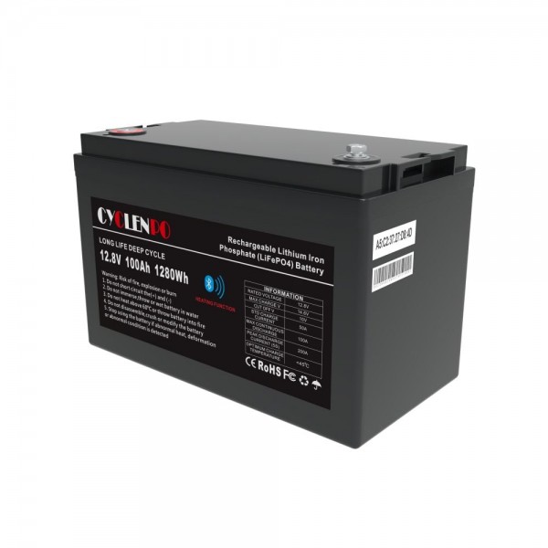 Акумуляторна батарея літій-залізо-фосфатна (LiFePO4) з функцією підігріву та вбудованим Bluetooth; ємність 100 Аг; напруга 12.8 В; макс. струм заряду 50 А / розряду 100 А; кількість циклів: > 6000; клас захисту IP65; розміри 328 / 171 / 215 мм; вага 9.85 кг