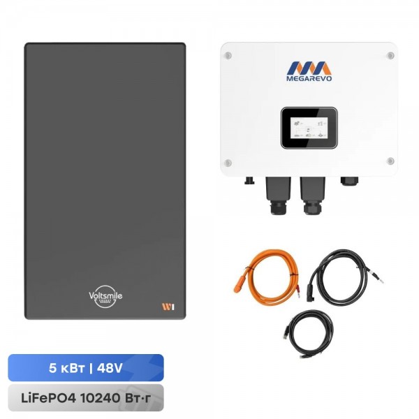 Комплект резервного живлення: гібридний інвертор 5kW Megarevo й акумуляторна батарея 48В 2400Втг Voltsmile V5 LiFePo4. Однофазний гібридний інвертор; максимальна потужність 5 кВт, максимальна короткочасна потужність 7.5 кВт; правильна синусоїда на виході 220 В; вбудований MPPT-контролер та мережевий зарядний пристрій; максимальний струм заряду/розряду 100 А/100 А; вхідна напруга 176-270 В; діапазон напруги від сонячних панелей 100-440 В, макс. потужність 7.5 кВт; ККД 96%; вихідна напруга 230 В; вихідна частота 50/60 Гц; напруга акумуляторної системи 48 В; час перемикання на АКБ 10 мс; підтримка заряду АКБ типу AGM/GEL/LiFePo4/Li-ion; комунікаційні інтерфейси CAN, RS485, DRM, сухі контакти; WiFi-адаптер у комплекті – для моніторингу з мобільного застосунку; сенсорний LCD-дисплей; режим підмішування; захист від перевантаження, короткого замикання, перенапруги; настінний монтаж; клас захисту IP65; робоча температура -25°C~+60°C; розміри 455 / 447 / 200 мм, вага 17 кг. Настінна літій-залізо-фосфатна акумуляторна батарея; напруга 51.2 В; ємність 200 Аг / 10240 Втг; максимальний струм заряду/розряду 100 А/100 А; ресурс: 6000 циклів заряджання-розряджання; комунікаційні порти CAN, RS485; клас захисту IP67; в одну систему можна підключити до 16 акумуляторних модулів; розміри 888 / 518 / 150 мм; вага 90 кг. Комплект кабелів для підключення акумуляторних батарей Voltsmile серій W, V, RPC до інвертора містить: кабель живлення від акумулятора до інвертора «+» 4AWG, довжина 2 м – 1 шт.; кабель живлення від акумулятора до інвертора «-» 4AWG, довжина 2 м – 1 шт.; кабель зв’язку між акумулятором та інвертором 4AWG, довжина 2 м – 1 шт.