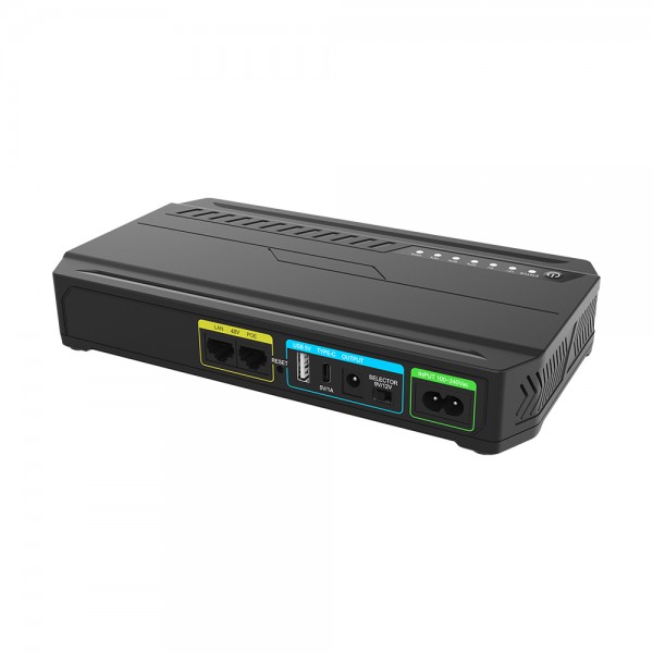 Джерело безперебійного живлення з 4 вбудованими акумуляторними батареями LiFePO4 ємністю 6000 мА·год (загальна ємність 24000 мА·год), роз’ємом Type-C та гігабітним PoE-портом; максимальна вихідна потужність 18 Вт; вихідні інтерфейси USB, Type-C, DC, PoE 1 Гбіт/с, вихідна напруга 5 В + 5 В + 9/12 В + 48 В (PoE); вихідна напруга/струм кожного виходу: USB: 5В/2А, Type-C: 5В/1А, DC: 9В/2А, 12В/1.5А, PoE: 48В/0.35А; вхідна напруга AC 100-240 В/50-60 Гц; розміри 230 / 125 / 38 мм, вага 900 г. У комплекті мережевий кабель живлення 220В для мініДБЖ довжиною 80 см, кабель живлення DC-DC довжиною 33 см з роз’ємами, розгалужувач живлення DC-2 DC (25 см) загальною довжиною 60 см з роз’ємами