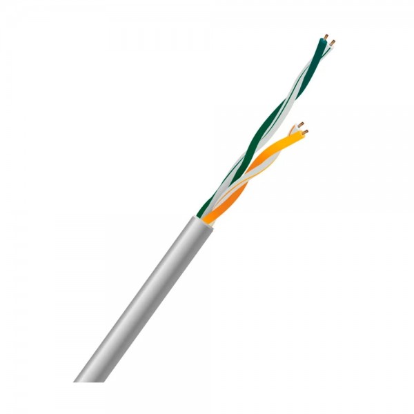 Кабель мережевий вита пара UTP неекранований категорії 5e, для внутрішнього прокладання; для створення мереж 100 Мбіт/с; 2 пари жил, діаметр 0.5 мм; матеріал провідника мідь; ізоляція провідників поліетилен; зовнішня оболонка PVC (полівінілхлорид) сірого кольору; максимальна частота сигналу 100 мГц; опір кабелю 27-28 Ом; довжина бухти 500 м