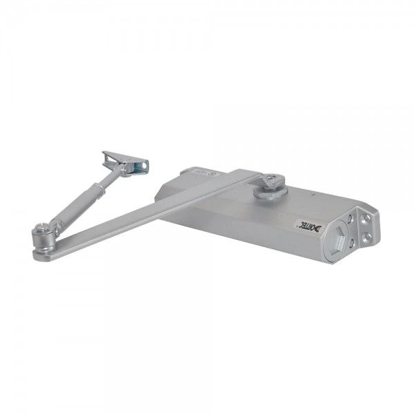 Дверний доводчик; конструкція тяги – складаний важіль; маса дверного полотна 25-150 кг; розміри 250 / 46 / 67 мм; колір срібний