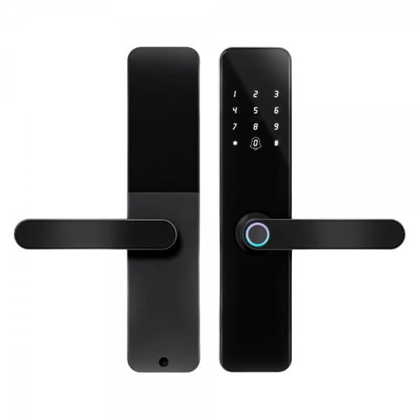 Біометричний автономний електрозамок з Wi-Fi і зчитувачем відбитків пальців та карт Mifare 13.56 МГц; відімкнення за допомогою: відбитку пальця, коду, картки, застосунку, ключа; кількість користувачів до 200; роз'єм USB Type-C; застосунок для роботи Tuya; живлення 4*АА батарейки; тип і матеріал дверей: лівобічні / правобічні, металеві / пластикові / дерев'яні; врізний монтаж; матеріал корпусу алюмінієвий сплав; розміри 280 / 64 мм