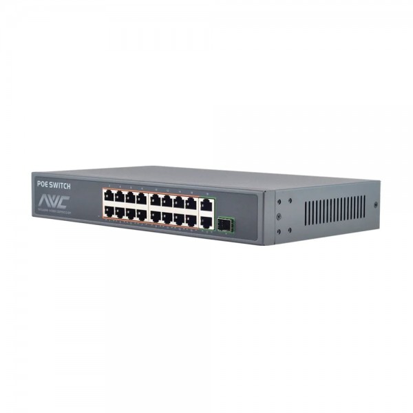 18-портовий PoE-комутатор з 16 портами PoE 100Mб + 2 порти Uplink 10/100/1000Mб + 1 порт SFP gigabit Uplink (не комбо); пропускна здатність 12.8 Гбіт/с; стандарт живлення PoE: IEEE802.3at/af, PoE Pin: 1,2+/3,6-; загальна потужність навантаження 150 Вт (до 30 Вт на порт); режим Extend/ON: 1-16 порт 10Mб PoE-відстань до 250 м; живлення AC100~240V, 50~60 Гц; робоча температура від -5°C до +45°C; розміри 295 / 165 / 44 мм