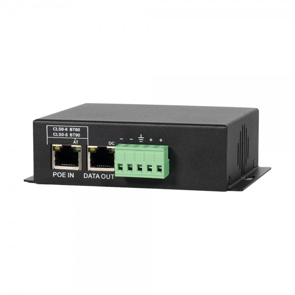 PoE-сплітер; стандарт PoE IEEE802.3bt; потужність PoE 90 Вт; швидкість передачі 10/100/1000 Мбіт/с; вихідна напруга 12 В; вихідний струм 7 А; LED-підсвічування; робоча температура від -40°C до +75°C; клас захисту: IP30; розміри 128 / 90 / 34 мм; вага 0.5 кг