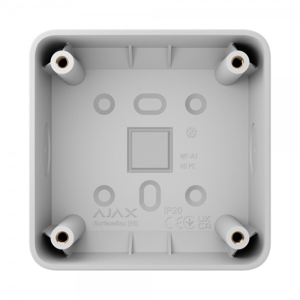 Коробка для зовнішнього встановлення одного вимикача чи розетки Ajax LightSwitch / Ajax Outlet; формфактор європейського типу 55; прокладання кабелів ззаду або збоку; матеріал полікарбонат; клас захисту IP20; робоча температура -10°C~+40°C; розміри 82.6 / 82.6 / 46.8 мм; вага 63.5 г