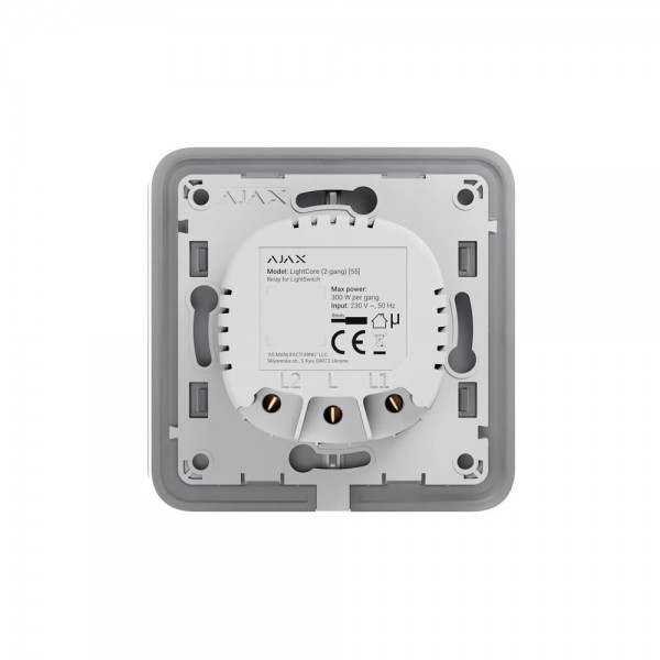 Реле для двоклавішного розумного вимикача LightSwitch – одинарного чи комбінованого. Дальність зв'язку з централлю до 1100 м, робоча частота 868-868.6 МГц, протокол Jeweller; потужність комутованого приладу до 300 Вт на сегмент; підтримка сценаріїв автоматизації; не використовує нульовий дріт живлення, потребує лише фази живлення для роботи; живлення 230 В; споживання до 200 мВт; захист від несумісних приладів, за струмом, за температурою. Розміри 76.3 / 72.3 / 29.2 мм, вага 53.9 г