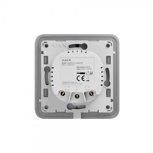 Реле для прохідного розумного вимикача LightSwitch – одинарного чи комбінованого. Дальність зв'язку з централлю до 1100 м, робоча частота 868-868.6 МГц, протокол Jeweller; потужність комутованого приладу від 5 до 600 Вт; підтримка сценаріїв автоматизації; не використовує нульовий дріт живлення, потребує лише фази живлення для роботи; живлення 230 В; споживання до 200 мВт; захист від несумісних приладів, за струмом, за температурою. Розміри 76.3 / 72.3 / 29.2 мм, вага 48.34 г