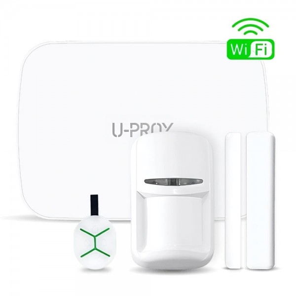 Комплект бездротової сигналізації у складі: централь з літій-іонним акумулятором 2500 мАг, до 24 годин автономності, зовнішній блок живлення 12 В; брелок керування U-Prox Keyfob b4 з елементом живлення CR2032; детектор руху U-Prox PIR (імунітет від тварин до 20 кг) з елементом живлення CR123A; магнітоконтактний сповіщувач U-Prox WDC з елементом живлення CR123A; ємність системи: 250 користувачів, до 250 бездротових датчиків, 30 клавіатур, 250 брелоків, 8 радіоретрансляторів, 150 пристроїв автоматизації; передача сповіщень у мережі стандарту LTE/GSM (4G/2G), WiFi, Ethernet; підключення до U-Prox Cloud і налаштування за допомогою мобільного або WEB-застосунку U-Prox Installer