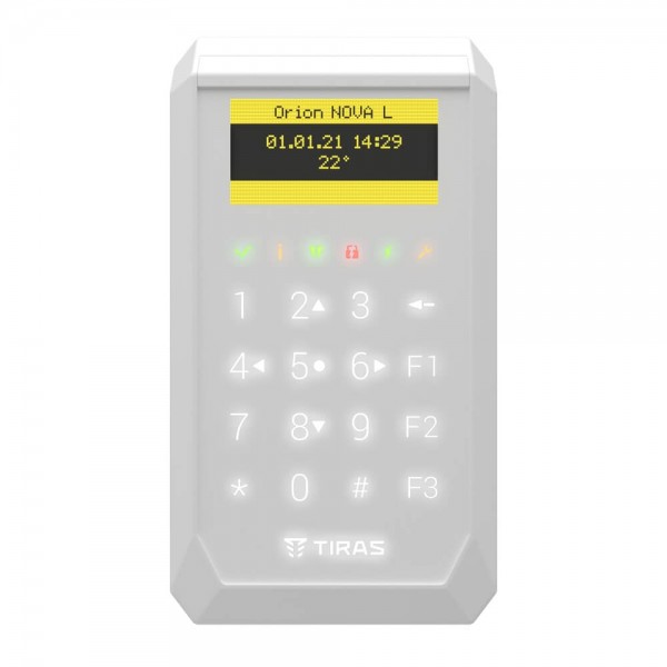 Сенсорна OLED-клавіатура з вбудованим зчитувачем NFC/Mifare для керування охоронною системою на базі Orion NOVA; 2 власних зони сигналізації; можливість підключення двох дротових датчиків та виносного світлодіода; персональні коди доступу; захист від підбору коду доступу; підключення через системну шину RS485 з довжиною лінії до 1000 м; живлення 12 В; споживання 120 мА; робоча температура від -10°C до +40°C; розміри 88 / 160 / 19 мм; вага 150 г