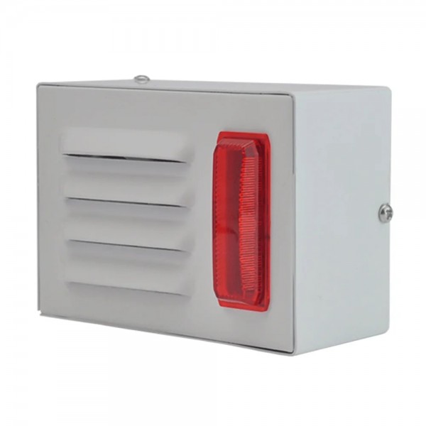 Вулична світлозвукова сирена; акустична потужність 110 дБ; напруга живлення 12 В; струм споживання 200 мА; зовнішнє встановлення; металевий корпус; робоча температура -30°C~+55°C; розміри 122 / 85 / 52 мм; вага 380 г