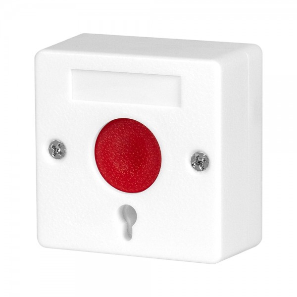 Тривожна кнопка для прихованої подачі сигналу тривоги у разі виявлення небезпеки; тип контакту Н/Р (нормально-розімкнений), Н/З (нормально-замкнений); тип монтажу накладний; з розфіксацією ключем, ключ для розблокування у комплекті; розміри 52 / 52 / 15 мм