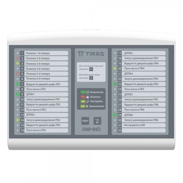 Адресна виносна панель індикації для роботи в адресній пожежній системі Tiras PRIME A; підключення до адресного інтерфейсу; 32 індикатори стану системи; вбудований ізолятор короткого замикання; зумер; зовнішнє джерело живлення 12/24 В; ступінь захисту корпусу IP30; робоча температура від -10°C до +40°C; розміри 270 / 200 / 50 мм