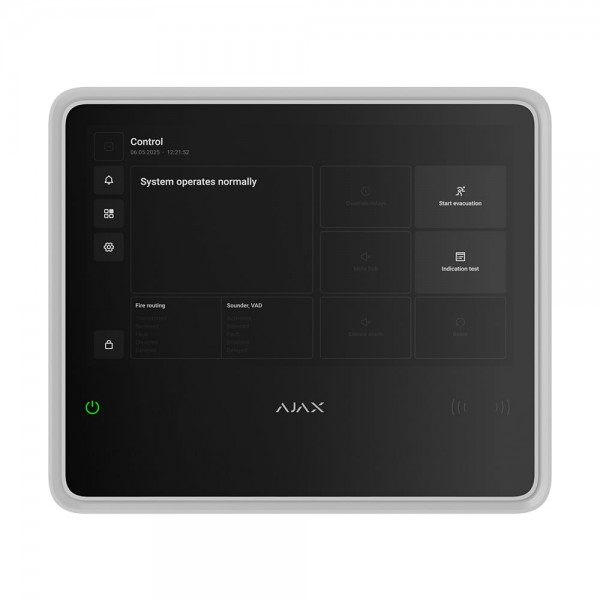 Бездротовий прилад приймально-контрольний пожежний з підтримкою пристроїв Ajax EN54 та охоронних пристроїв; підтримка до 200 пристроїв, до 40 пожежних зон, до 80 груп охорони, до 200 користувачів, до 36 відеореєстраторів Ajax та до 224 камер, до 64 сценаріїв; підтримка фотоверифікації (до 5 фото за тривогою, сценарієм, розкладом); журнал подій до 5000 записів; канали зв’язку Wi-Fi, 2G/4G – 2 SIM, Ethernet; протокол Jeweller, дальність зв’язку до 1800 м; сенсорний дисплей 10.1"; типи сповіщення: push, SMS, дзвінки; протоколи Wings, TurboWings, SIA (DC-09), SurGard (Contact ID); 2 релейні виходи (NC та NO); вбудований зумер 60 дБ; світлодіодна індикація; живлення основне 110-240 В, резервне від Li-ion батареї EN54 Internal Battery (24h/72h) – купується окремо; розміри 263 / 223 / 54 мм; вага 1526 г