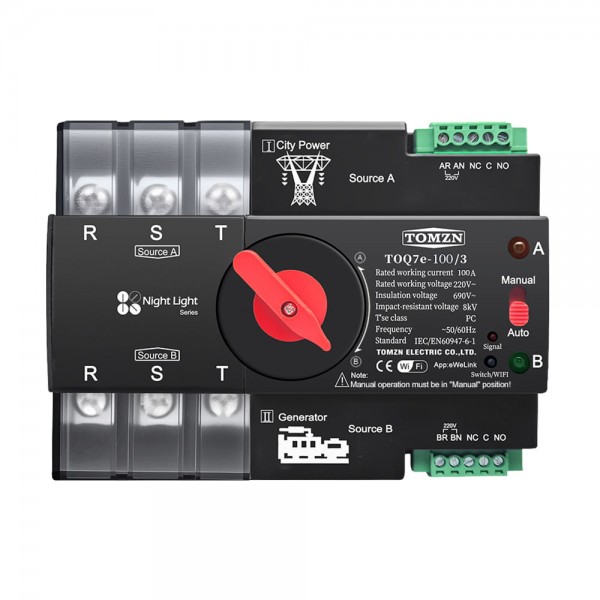 Автоматичний перемикач (автомат введення резерву) з Wi-Fi під DIN-рейку; кількість полюсів: 3; номінальний робочий струм: 100 А; номінальна робоча напруга: АС 400 В/50 Гц; номінальна напруга керування: АС 220 В/50 Гц; напруга ізоляції: АС 690 В/50 Гц; номінальна сила струму короткого замикання: 50 кА; номінальна імпульсна напруга, що витримується: 8 кВ; керування та налаштування через мобільний застосунок eWeLink; ручне/автоматичне керування; час перемикання: 0.008 с/8 мс; розміри 124.8 / 109 / 78 мм