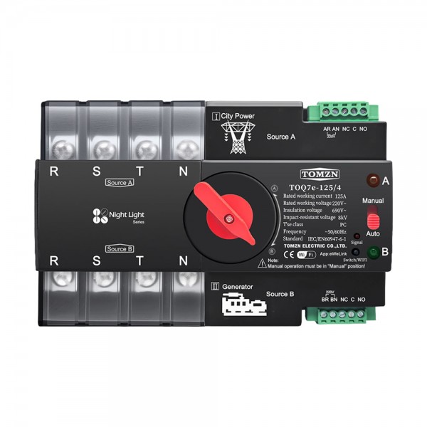 Автоматичний перемикач (автомат введення резерву) з Wi-Fi під DIN-рейку; кількість полюсів: 4; номінальний робочий струм: 125 А; номінальна робоча напруга: АС 400 В/50 Гц; номінальна напруга керування: АС 220 В/50 Гц; напруга ізоляції: АС 690 В/50 Гц; номінальна сила струму короткого замикання: 50 кА; номінальна імпульсна напруга, що витримується: 8 кВ; керування та налаштування через мобільний застосунок eWeLink; ручне/автоматичне керування; час перемикання: 0.008 с/8 мс; розміри 142 / 109 / 78 мм