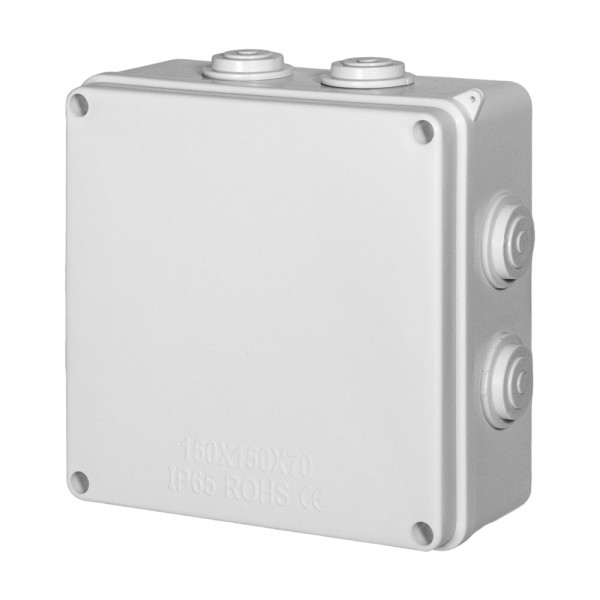Коробка розподільна з 7 кабельними вводами; у комплекті: 7 заглушок для вводів та комплект для кріплення кришки; клас захисту IP65; зовнішнього та внутрішнього встановлення; матеріал – пластик; розміри 150 / 150 / 70 мм