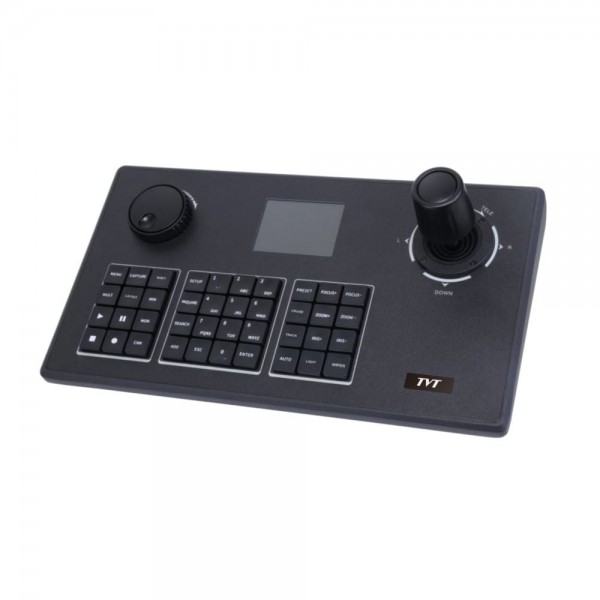 Пульт керування PTZ-камерами – 4D-джойстик для встановлення передналаштувань або маршруту патрулювання; режими керування: PTZ, послідовний порт, платформа відеоспостереження; керування до 256 камерами в режимі PTZ; мережевий інтерфейс RJ45 10/100M; порти RS422, RS232; швидкість передачі 1200-19200bps; TFT LCD дисплей 320*240 пікселів; живлення DC12V 2A / PoE (IEEE802.3af), споживання 5 Вт; розміри 321 / 179.2 / 108.5 мм; вага 1.63 кг