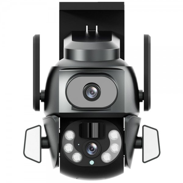 4Mp (2*2Mp) вулична поворотна IP-відеокамера з підтримкою Wi-Fi (2.4 ГГц), з подвійним об’єктивом і подвійним підсвічуванням; об’єктив (4 мм + 8 мм) для вільного перемикання з різними фокусними відстанями; матриця 1/2.8″ CMOS; роздільна здатність запису 1920*1080 x2; відеокодек H.264/H.265; кут повороту 0-350°, кут нахилу 0-90°; ІЧ-підсвічування до 20 м + LED 15 м; повнокольорове зображення в нічному режимі; віддалений моніторинг на смартфонах (застосунок CareCamPro); виявлення руху на відстані до 12 м, детекція людини; вбудований мікрофон та розмовний динамік; запис за детекцією на карту micro SD (до 128 Гб) або у хмарний сервіс; живлення 12В/1.2А, блок живлення у комплекті; потужність споживання 15 Вт; робоча температура -20°C~+60°C; клас захисту IP65; розміри 210 / 175 / 155 мм; вага 600 г