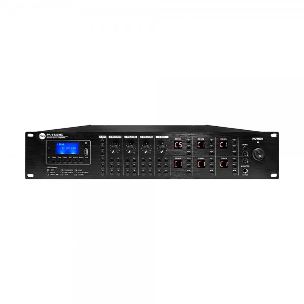 6-зонний матричний мікшуючий підсилювач; вихідна потужність 6x 120 Вт; вбудований MP3-медіаплеєр з USB/SD, FM-тюнер, Bluetooth; вихід на гучномовець 100 В/4-8 Ом; входи: мікрофон/лінія 1-3, лінія 1-2 RCA, EMC-вхід (високопріоритетний, аварійний); віддалене керування з ІЧ-пульта з комплекту; живлення AC 230 В/ DC 24 В; розміри 484 / 320 / 88 мм; вага 15.5 кг