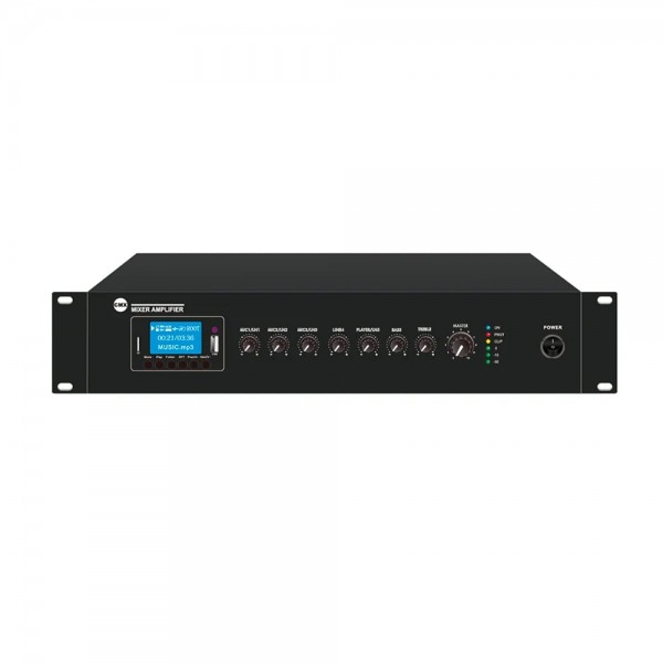 Мікшуючий підсилювач на одну зону. Вбудована технологія трансформатора 100 В/70 В. Настільний підсилювач з MP3-плеєром, FM-радіо та Bluetooth, SD Card. Вихід динаміка 100 В або 70 В та 4 Ом-8 Ом-16 Ом. Монтаж у стійку 19"